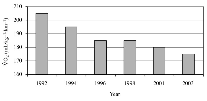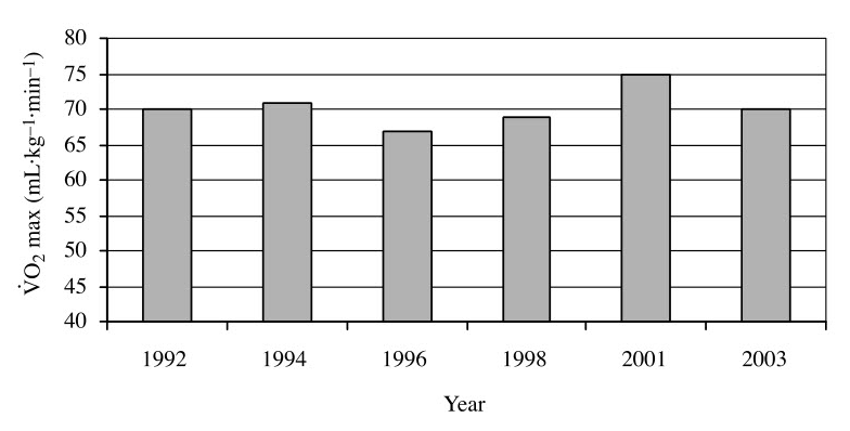 Le graphique ci-dessous présente l’évolution de sa VO2max entre 1992 et 2003. Au cours de cette période, ses performances se sont considérablement améliorées pourtant, sa VO2max n’a presque pas changé. Mais alors pourquoi a-t-elle progressé ?